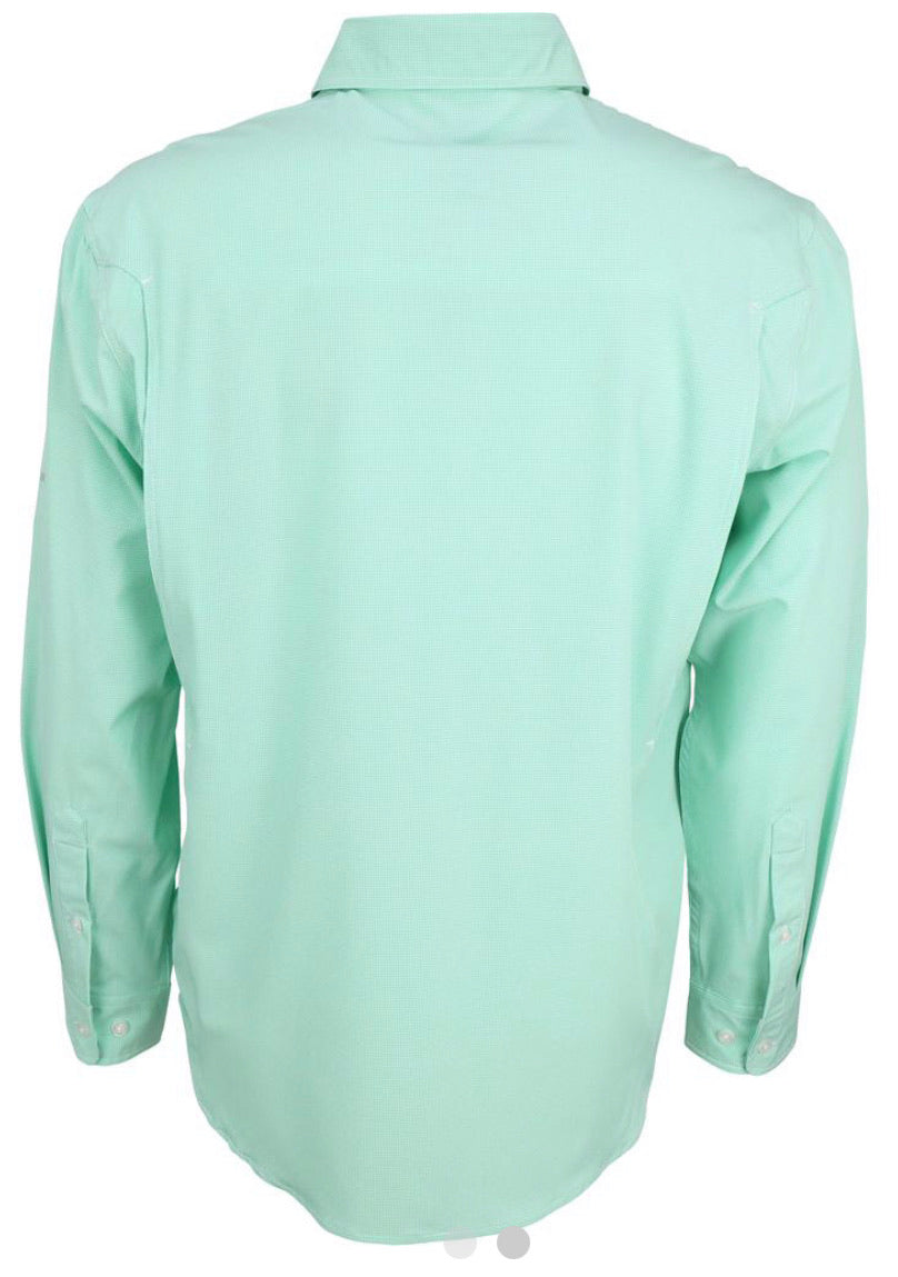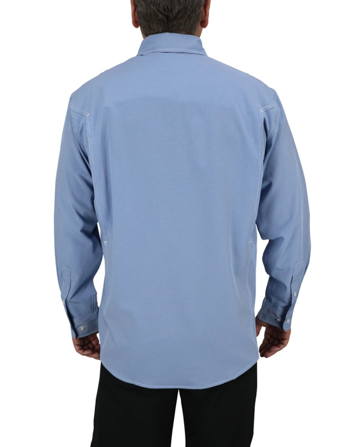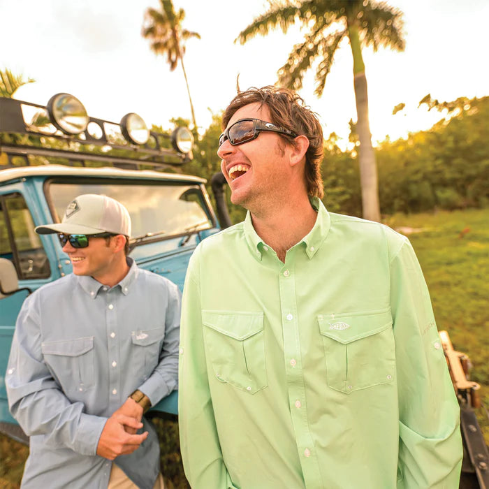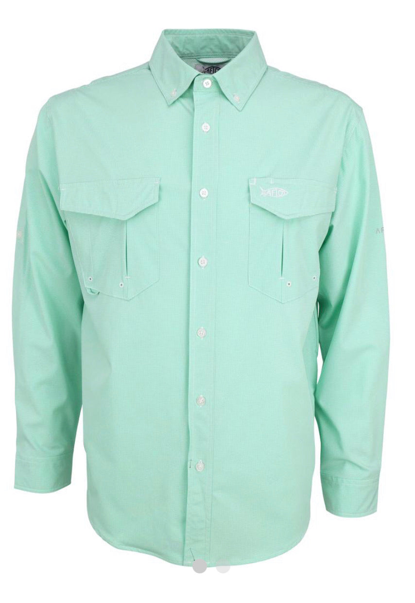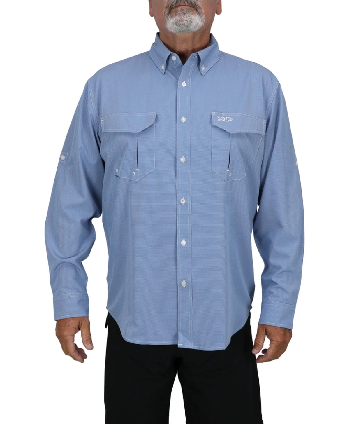 AFTCO's stretchy Apex long sleeve button down shift have a 4-way stretch combined with performance features; UPF 50 sun protection, DWR stain resistance, and vertical vents in the rear. Other essential features include polyester, elastane blended ultralight fabric and built in microfiber lens cleaner for cell phones or sun glasses.