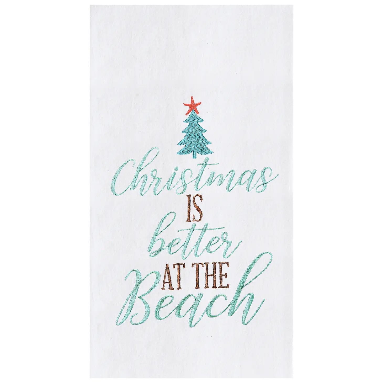 Make cleaning up after baking your famous chocolate chip cookies a stylish affair with this machine washable woven cotton towel. Add a coastal charm with these festive designs featuring embroidered Christmas trees and the saying Christmas Is Better At The Beach. 18" x 27" of cotton magic will surely bring the cheer in your home this season!