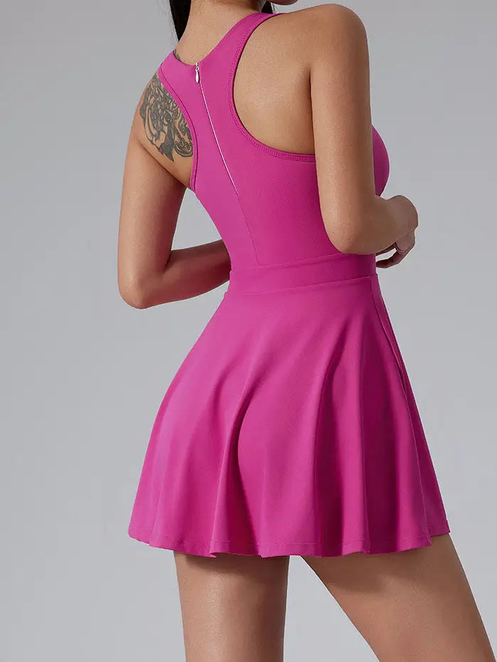 Serve up style and comfort with the Orchid Tennis Dress! Its fitted waist highlights your curves, while matching bike shorts keep you covered and free to move. The classic U-neckline adds a touch of timeless charm, making it perfect for both intense matches and casual hangouts. Get ready to ace your look on and off the court!
